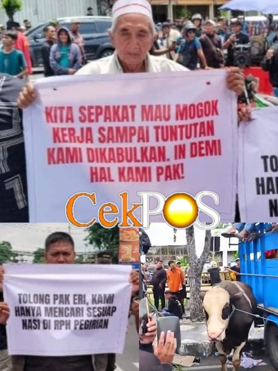 Selain itu, massa lainnya terlihat membentangkan poster dan bendera di halaman depan gedung DPRD. Dalam poster-poster tersebut, para demonstran menyuarakan tuntutan agar RPH Pegirian tidak dipindahkan dari lokasi semula.