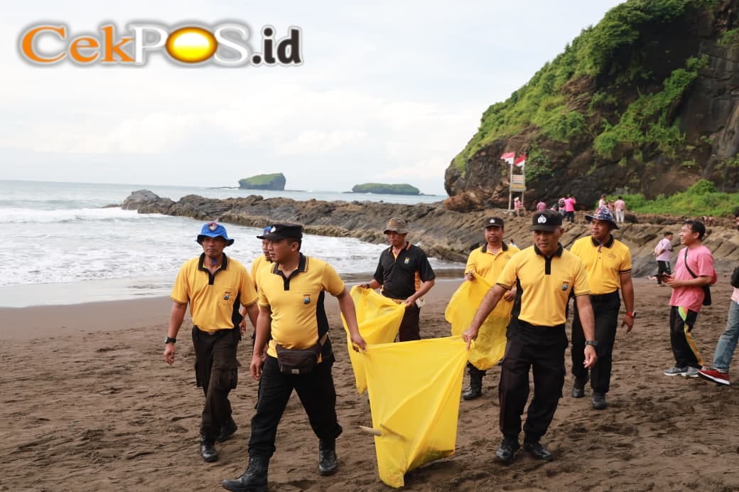 Sejumlah Pejabat Utama Polres Jember, Muspika Kabupaten Jember yang terdiri dari unsur TNI, pemerintah kecamatan, desa, serta elemen masyarakat menyisir dan membersihkan sampah di pesisir pantai.
