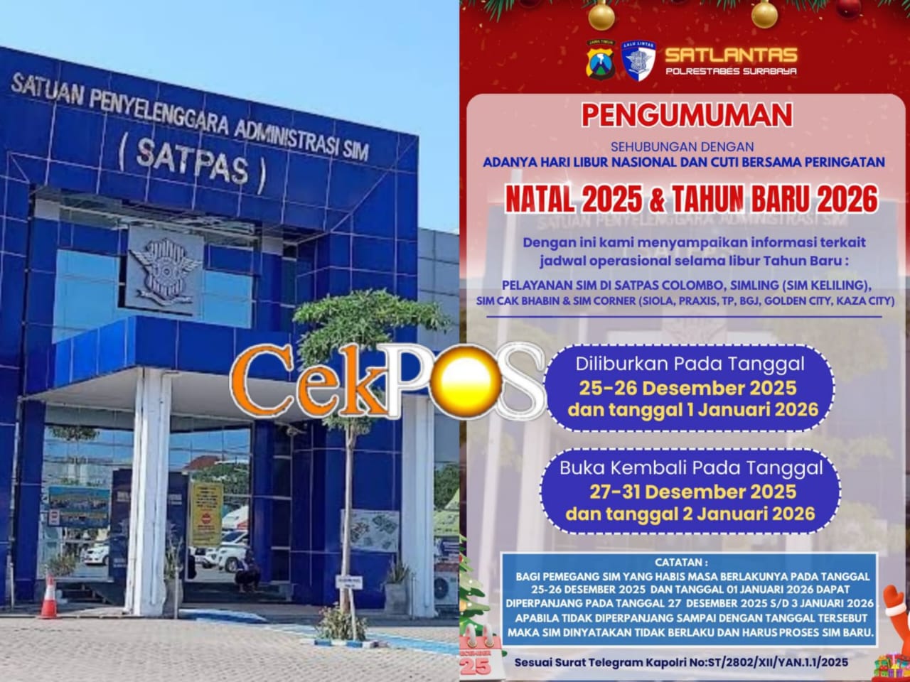 Kanit Regidet Satpas SIM Colombo – Polrestabes Surabaya yakni AKP Tri Arda Meidiansyah, S.TR.K, Sik, melalui Kasubnit Ipda Hariyo Indarto dan didampingi Ipda Dani mengatakan, Rabo (24/12/2025), tanggal-tanggal libur nasional dan cuti bersama sebenarnya telah diatur melalui Surat Keputusan Bersama Menteri Agama, Menteri Ketenagakerjan, dan Menteri Pendayagunaan Aparatur Negara (SKB 3 Menteri).