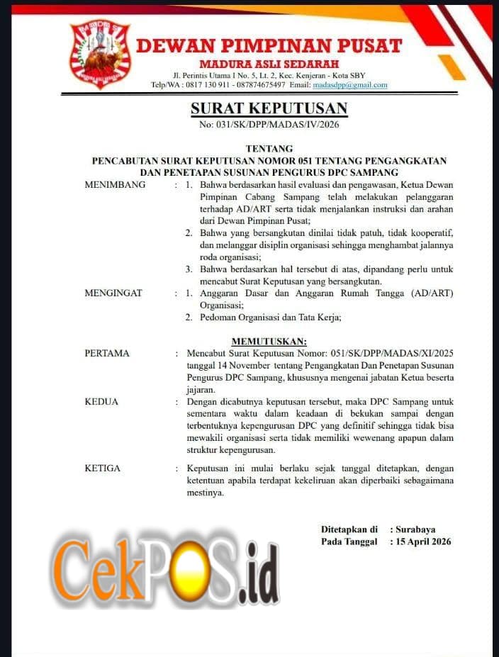 Dalam amar keputusan, DPP secara tegas mencabut SK sebelumnya, yakni Nomor: 051/SK/DPP/MADAS/XI/2025 tertanggal 14 November 2025 tentang pengangkatan dan penetapan susunan pengurus DPC Sampang, khususnya jabatan ketua beserta jajarannya.