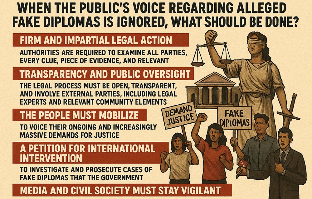 Kedua, rakyat harus bersuara dan bergerak. Jika lembaga gagal bertindak, rakyatlah yang harus melakukannya. Mobilisasi warga bukan sekadar hak, melainkan tanggung jawab. Protes damai, forum publik, dan kampanye digital harus terus memperkuat tuntutan keadilan. Isu ijazah palsu bukanlah hal sepele; isu ini melemahkan meritokrasi, pendidikan, dan supremasi hukum.