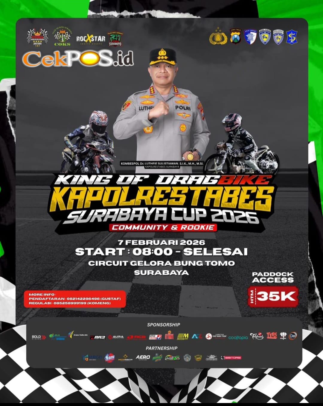 Dalam ajang King of Drag Bike Kapolrestabes Surabaya Cup 2026 ini, Kapolrestabes Surabaya Kombes Pol Lutfiie Setiawan, S.I.K, M.H, M.Si, mengatakan, Selasa (03/02/2025), ajang kompetisi balap motor lintasan lurus (biasanya 201 meter) yang bertujuan mewadahi hobi kecepatan di sirkuit resmi.