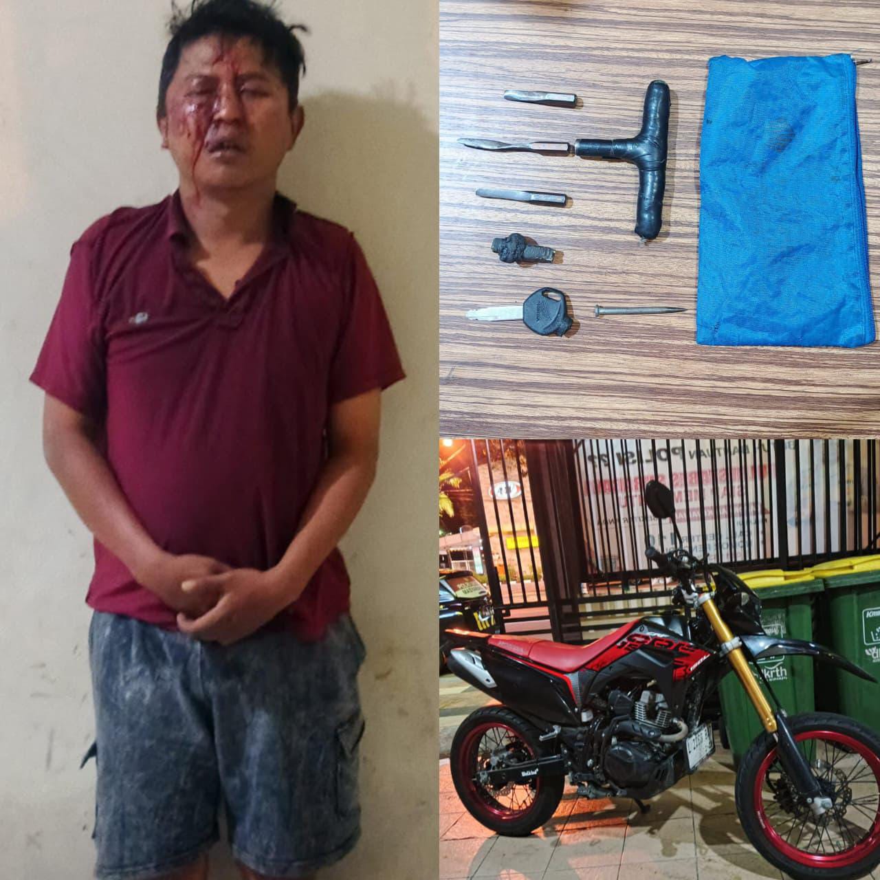 Seorang pria tak dikenal dengan cekatan sedang merusak kunci setir sepeda motornya, siap untuk membawa kabur motor sport bernomor polisi L 22.. BAT tersebut.
