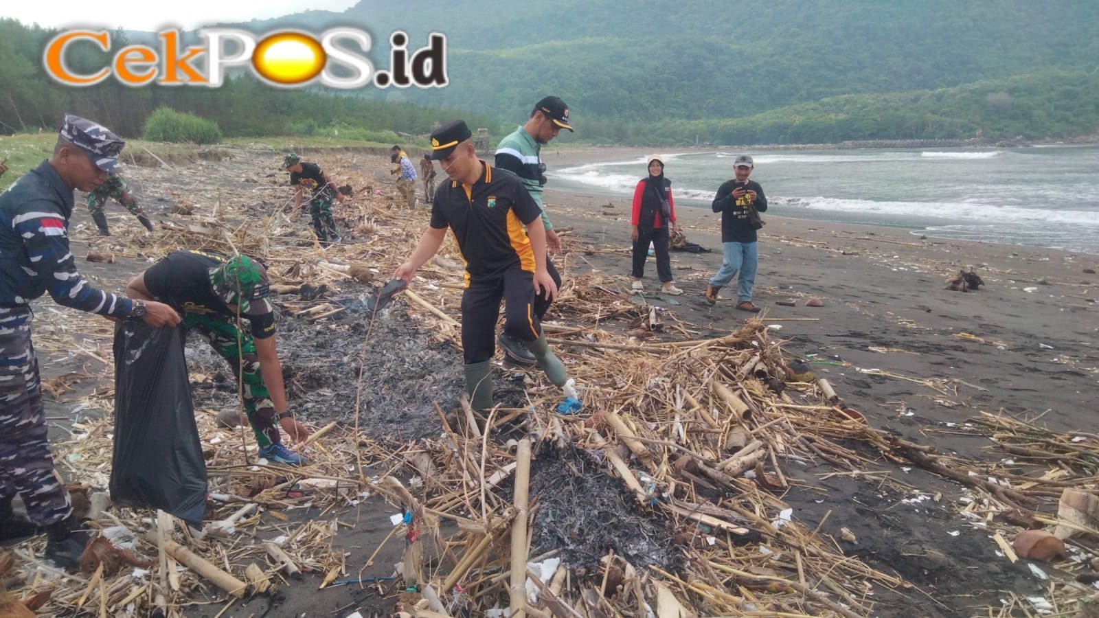 Sejumlah personel Polsek Puger yang merupakan jajaran Polres Jember Polda Jatim bersama anggota TNI dan masyarakat gotong royong menyisiri pantai, mengumpulkan sampah kayu, bambu, serta limbah yang terbawa arus laut dan berserakan di sepanjang pantai.
