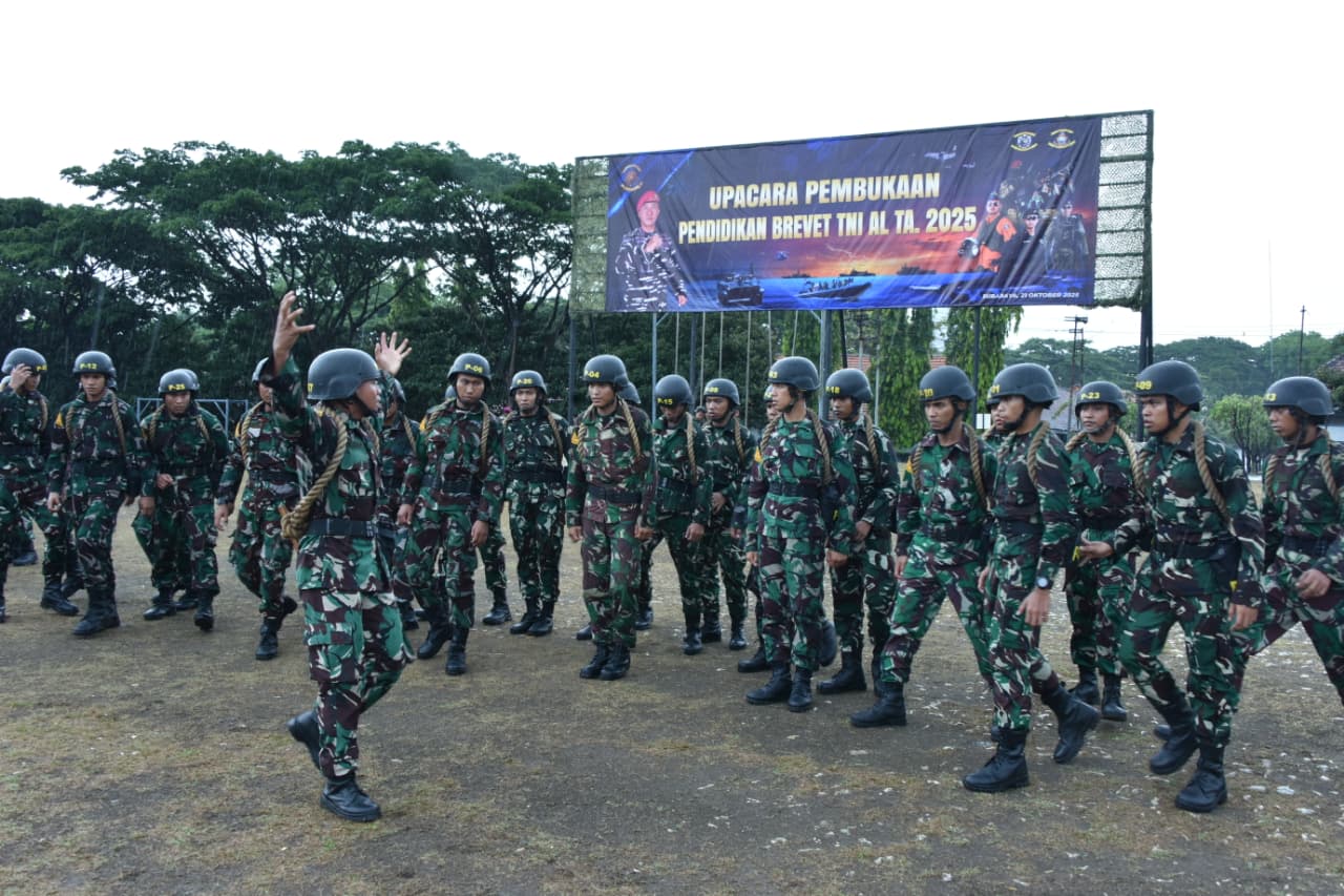 Surabaya – Dalam upaya membentuk prajurit-prajurit tangguh dengan kemampuan khusus, Komandan Kodiklatal (Dankodiklatal) Letjen TNI Marinir Nur Alamsyah secara resmi membuka Pendidikan Brevet (Dikbrevet) TNI AL Tahun 2025, yang digelar di Lapangan Apel Ewa Pangalila, Kodikmar Kodiklatal, Surabaya. Selasa (21/10/2025).