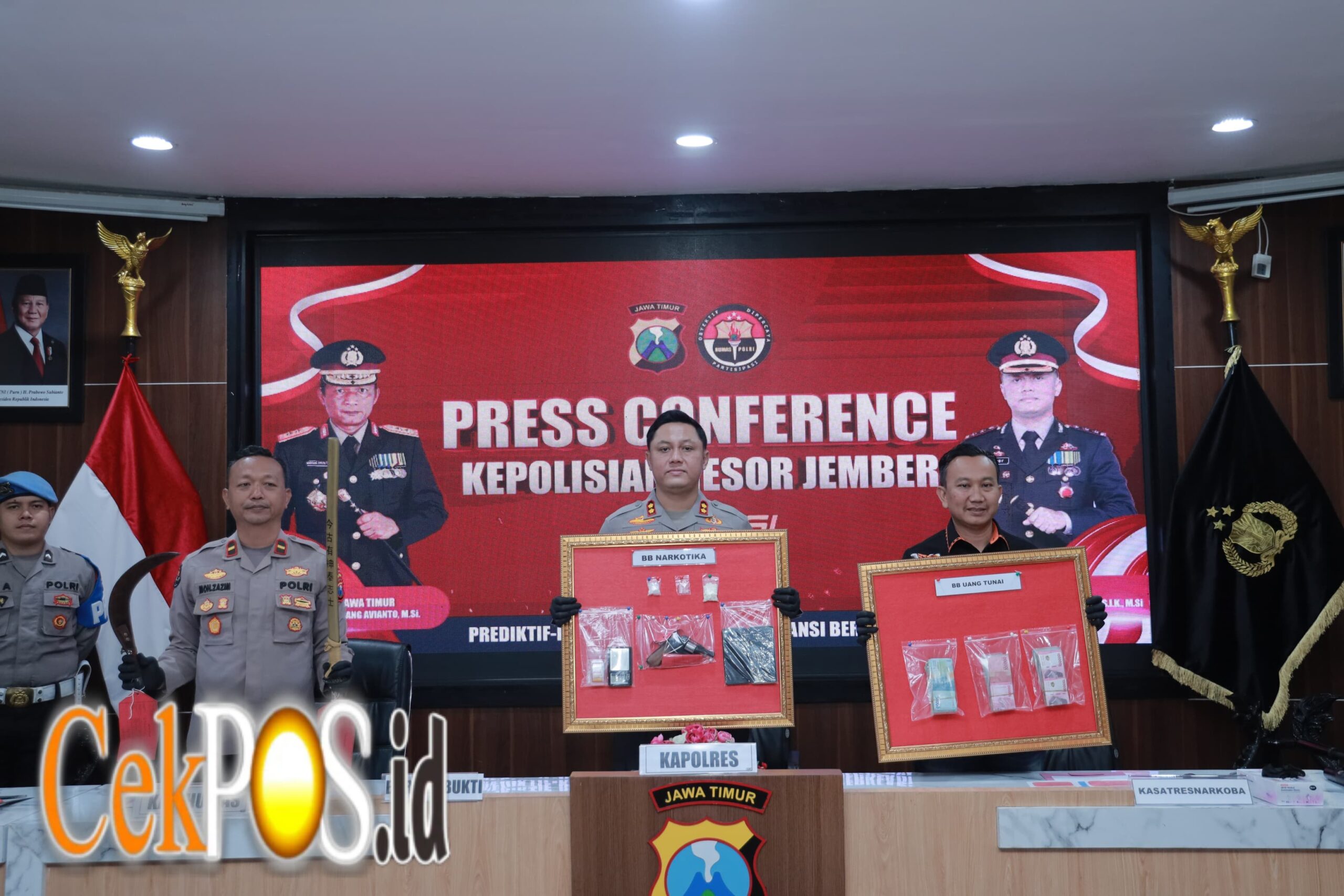 JEMBER, Cekpos.id – Kapolres Jember AKBP Bobby A. Condroputra menyampaikan capaian kinerja Satres Narkoba Polres Jember dalam press release pengungkapan peredaran gelap narkoba selama periode Maret 2026.