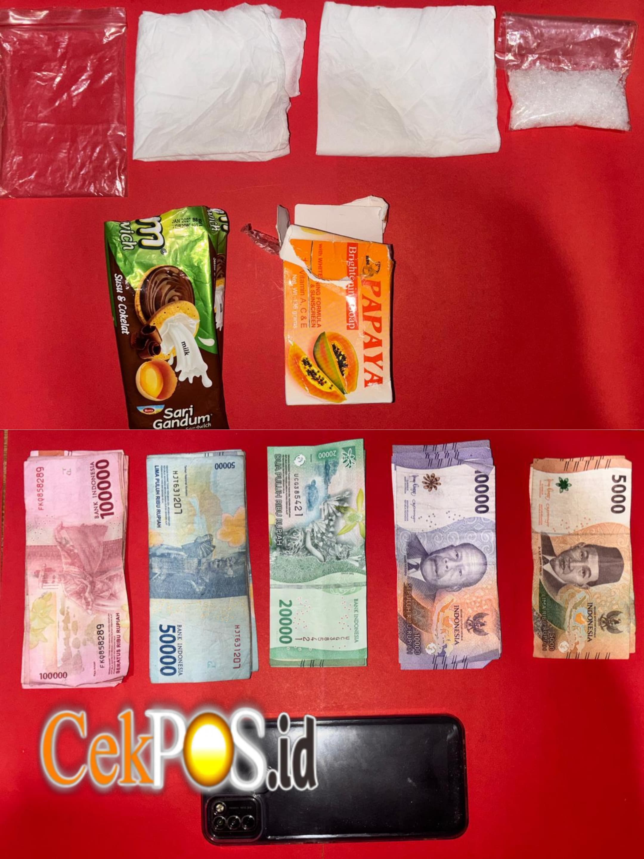Selain itu Polisi juga mengamankan 1 unit handphone warna hitam, serta beberapa barang lain seperti bekas bungkus jajan dan sabun yang digunakan untuk menyamarkan sabu.