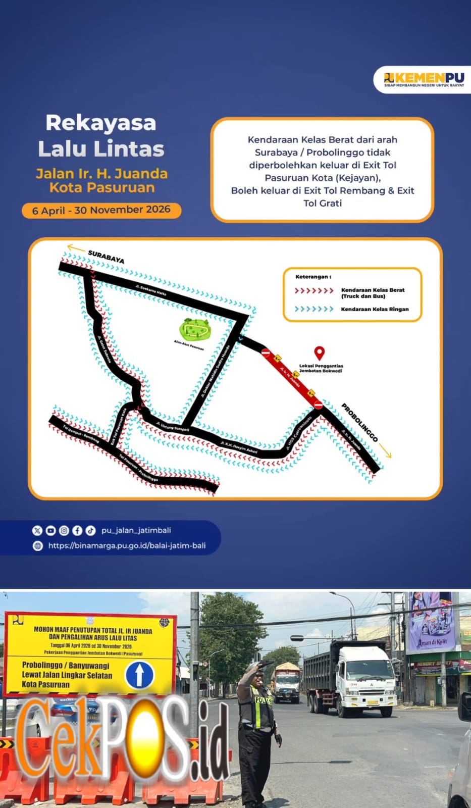 KOTA PASURUAN, Cekpos.id — Penutupan total Jalan Ir H Juanda Kota Pasuruan resmi diberlakukan mulai Rabu (08/04/2026).