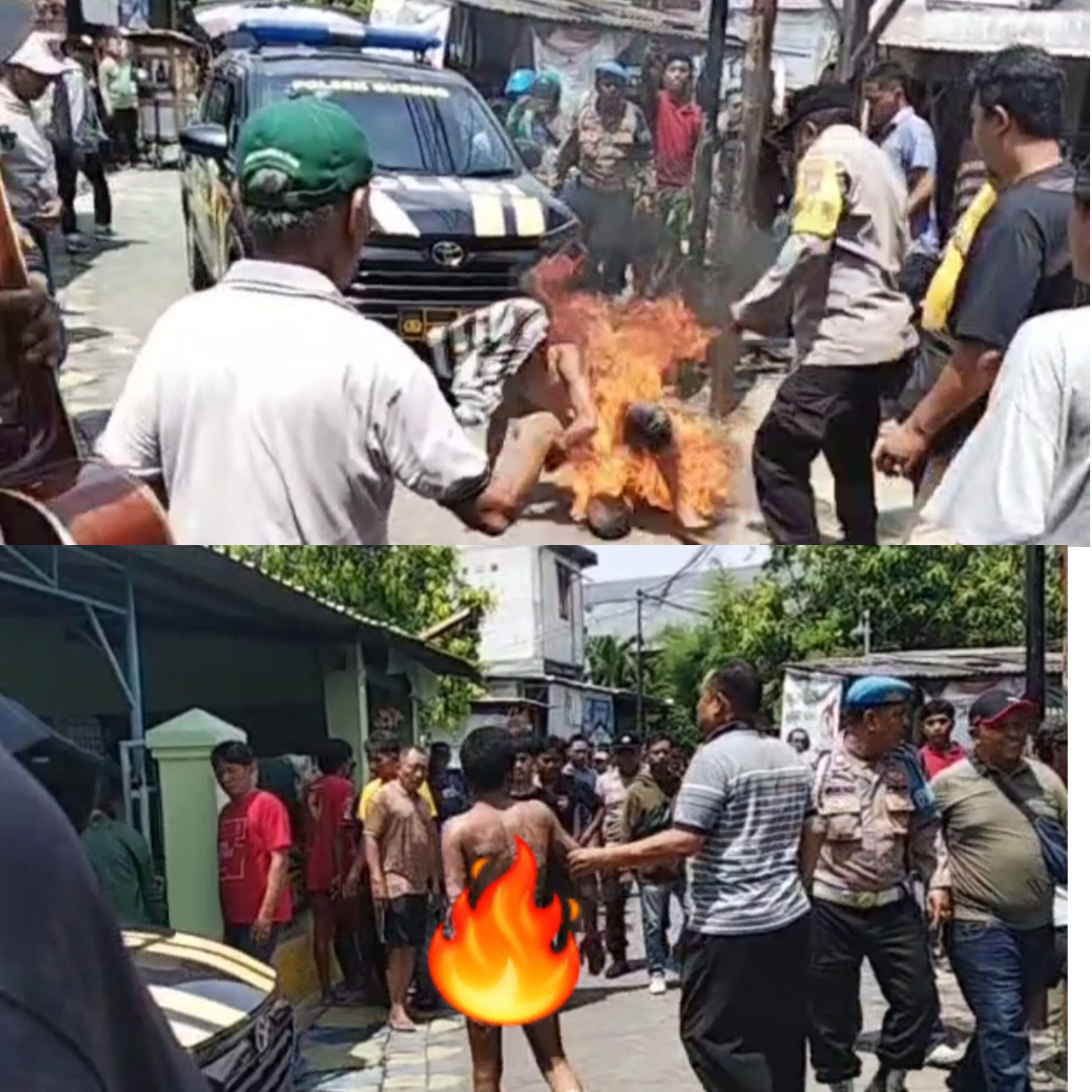Namun di tengah upaya petugas untuk mengevakuasi pelaku dari kerumunan, seorang oknum warga yang tak dikenal tiba² menyulutkan korek api.