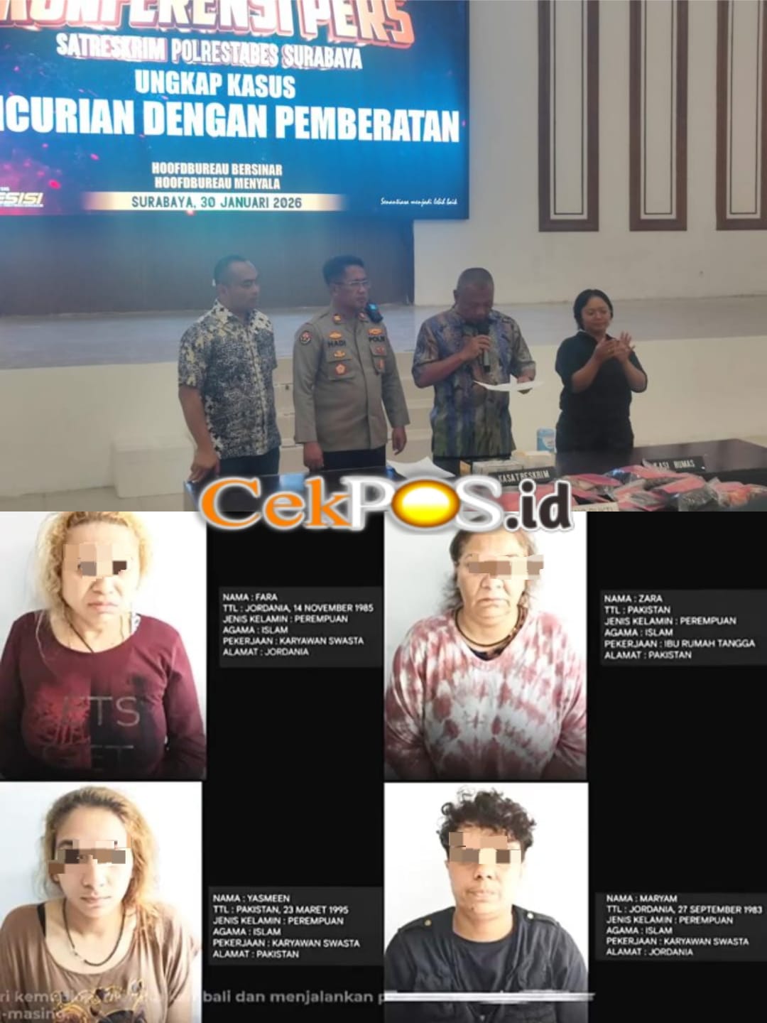 Keempat tersangka diketahui merupakan WNA yang berasal dari Pakistan dan Jordania. Mereka masing-masing berinisial Zara dan Yasmeen asal Pakistan, serta Maryam dan Fara asal Jordania. Para pelaku diketahui telah berada di Indonesia sejak tahun 2023 dan hidup secara nomaden dengan berpindah-pindah tempat tinggal.