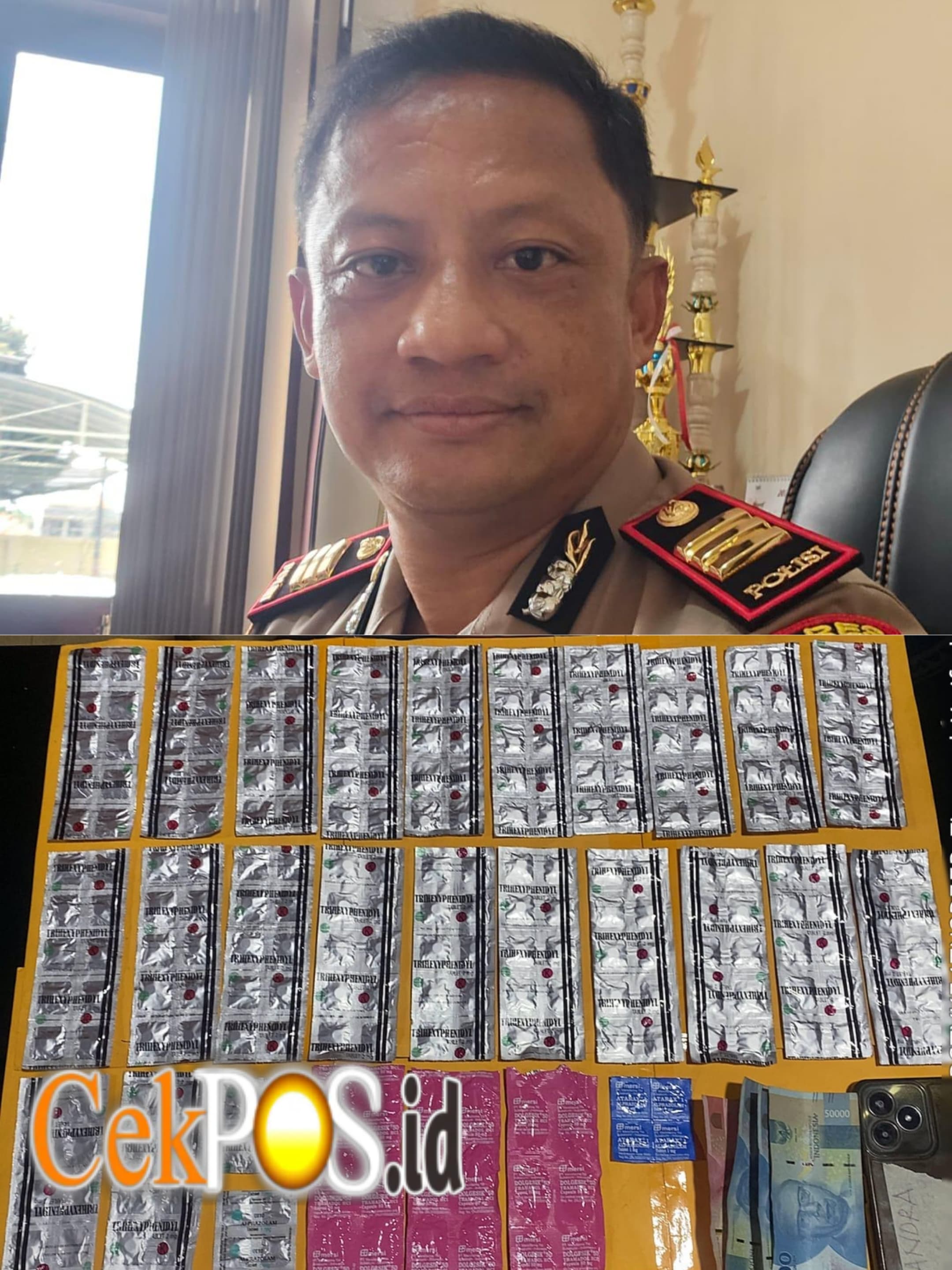 Dari tangan pelaku, petugas menyita ratusan butir obat keras daftar G, di antaranya Trihexyphenidyl, Dolgesik, Alprazolam, dan Atarax, serta uang tunai sejumlah Rp. 250.000,- yang diduga hasil transaksi dan satu unit telepon genggam yang digunakan dalam aktivitas peredaran.