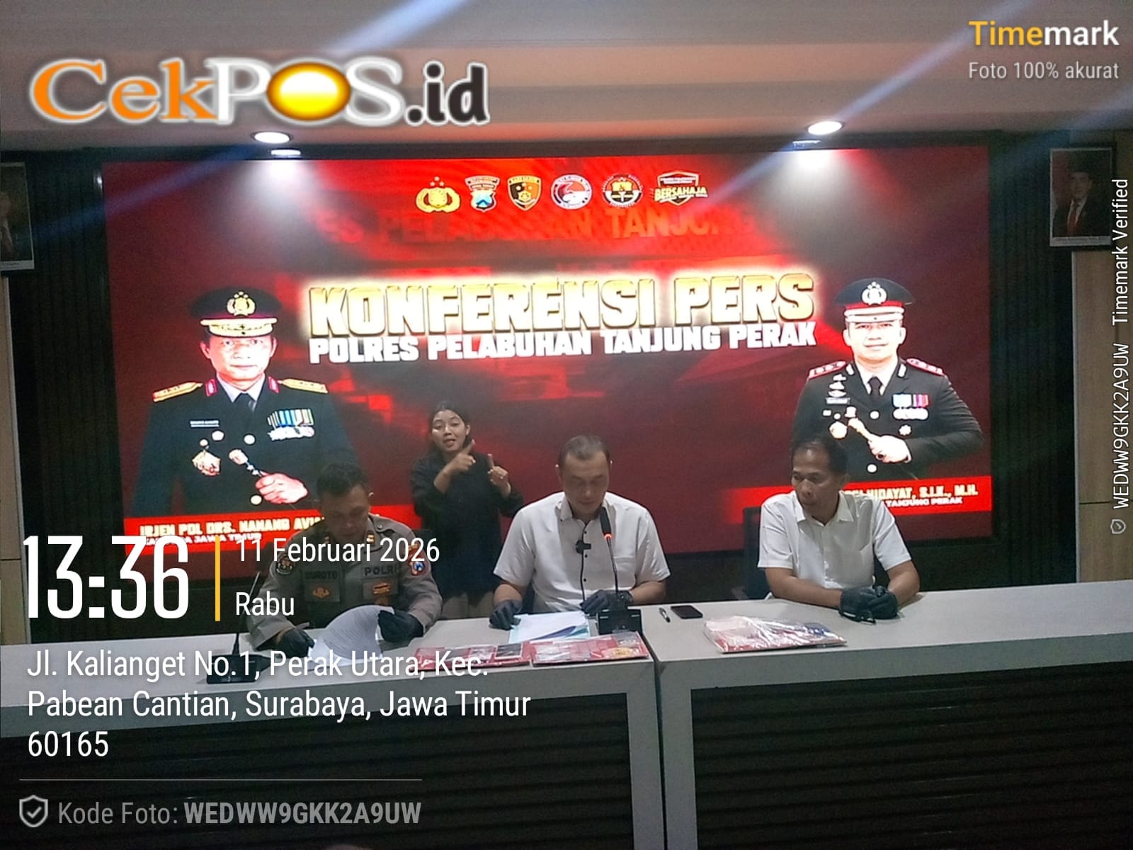Pers rillis didalam gedung Polres Pelabuhan Tanjung Perak pada hari Rabu tanggal 11/02/2026 sekira pukul 13.00 WIB.