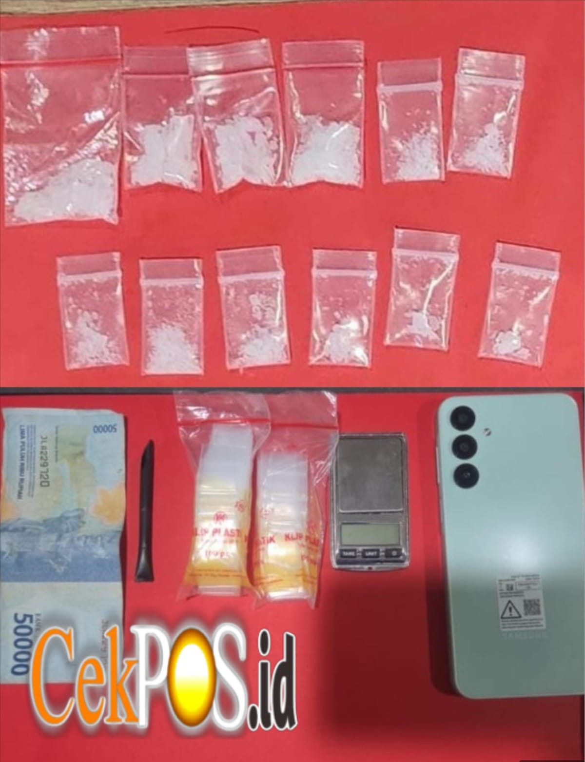 Barang bukti tersebut meliputi 12 paket plastik klip kecil berisi sabu dengan berat bruto total 6,77 gram, 1 unit timbangan digital, 2 bendel plastik klip kosong, 4 buah skrop dari sedotan warna hitam dan 1 unit telepon seluler yang digunakan untuk komunikasi transaksi.